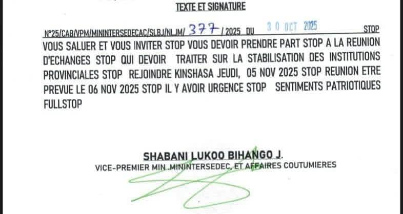 « Je vous salue et vous invite à prendre part à une réunion d’échanges portant sur la stabilisation des institutions provinciales. Vous êtes priés de rejoindre Kinshasa le jeudi 5 novembre 2025, la réunion étant prévue pour le 6 novembre 2025. La situation est urgente. Sentiments patriotiques. »