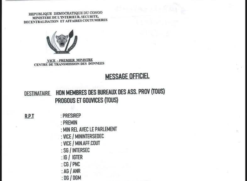 Le Vice-Premier Ministre, Ministre de l’Intérieur, de la Sécurité, de la Décentralisation et des Affaires coutumières, Shabani Lukoo Bihango, a adressé, ce 30 octobre 2025, un message officiel convoquant tous les gouverneurs, vice-gouverneurs ainsi que les membres des bureaux des assemblées provinciales à une réunion de concertation urgente à Kinshasa.